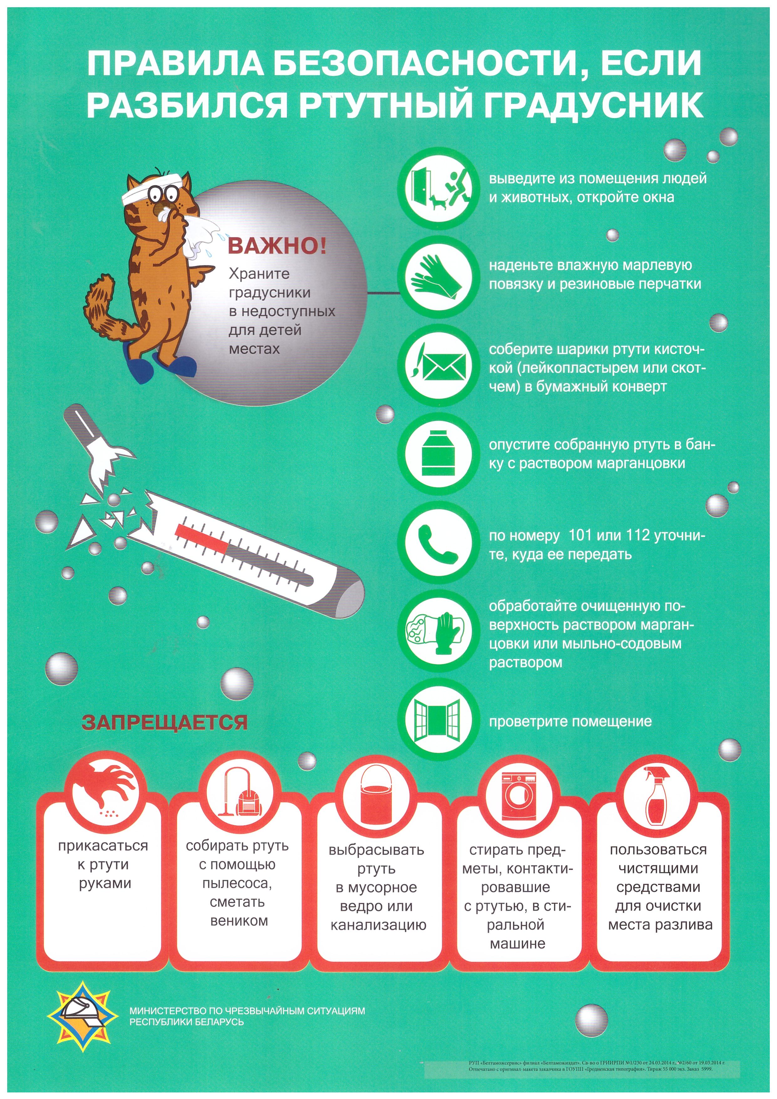 Гомельский городской отдел по ЧС напоминает: Устраивать панику из-за разбитого градусника не стоит. Но помните, ртуть — это токсическое вещество, обращение с которым потребует от вас грамотных и слаженных действий. Именно это позволит сохранить здоровье вам и вашим близким.