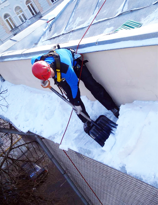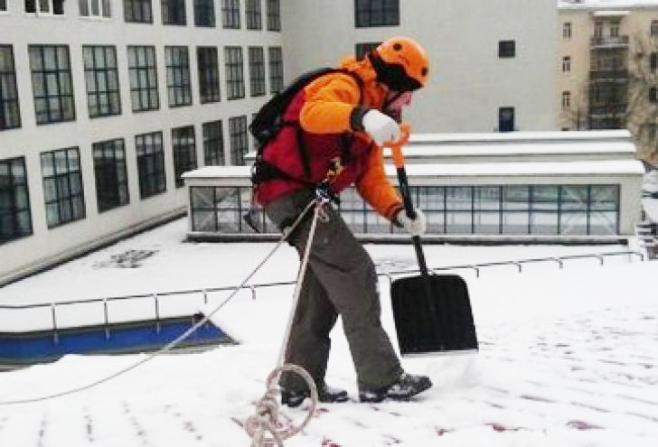 для очистки кровли применять деревянные лопаты или скребковые устройства. Очистку снега производить в валяной или резиновой обуви;
