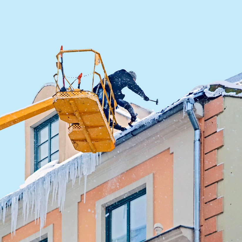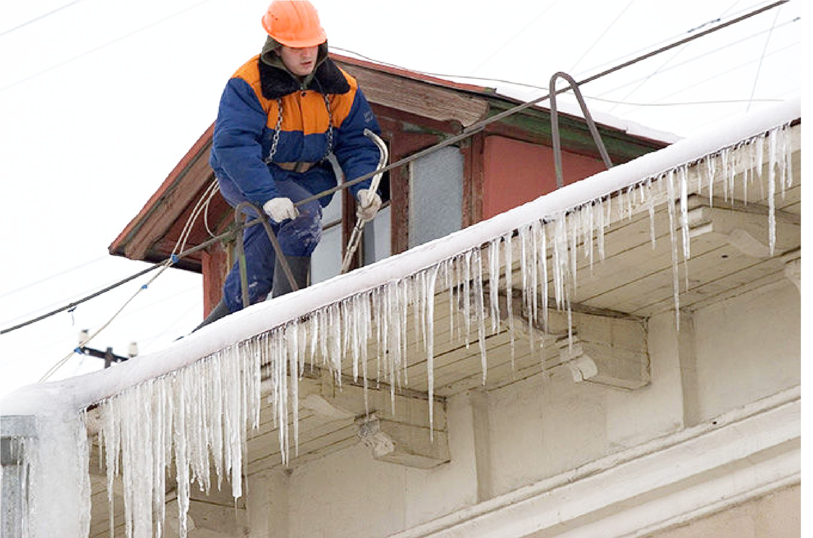 своевременно сбивать наледи и сосульки, свисающие с карнизов, козырьков зданий, используя специальные приспособления (крючки), с автогидроподъемников, автовышек и тому подобного;